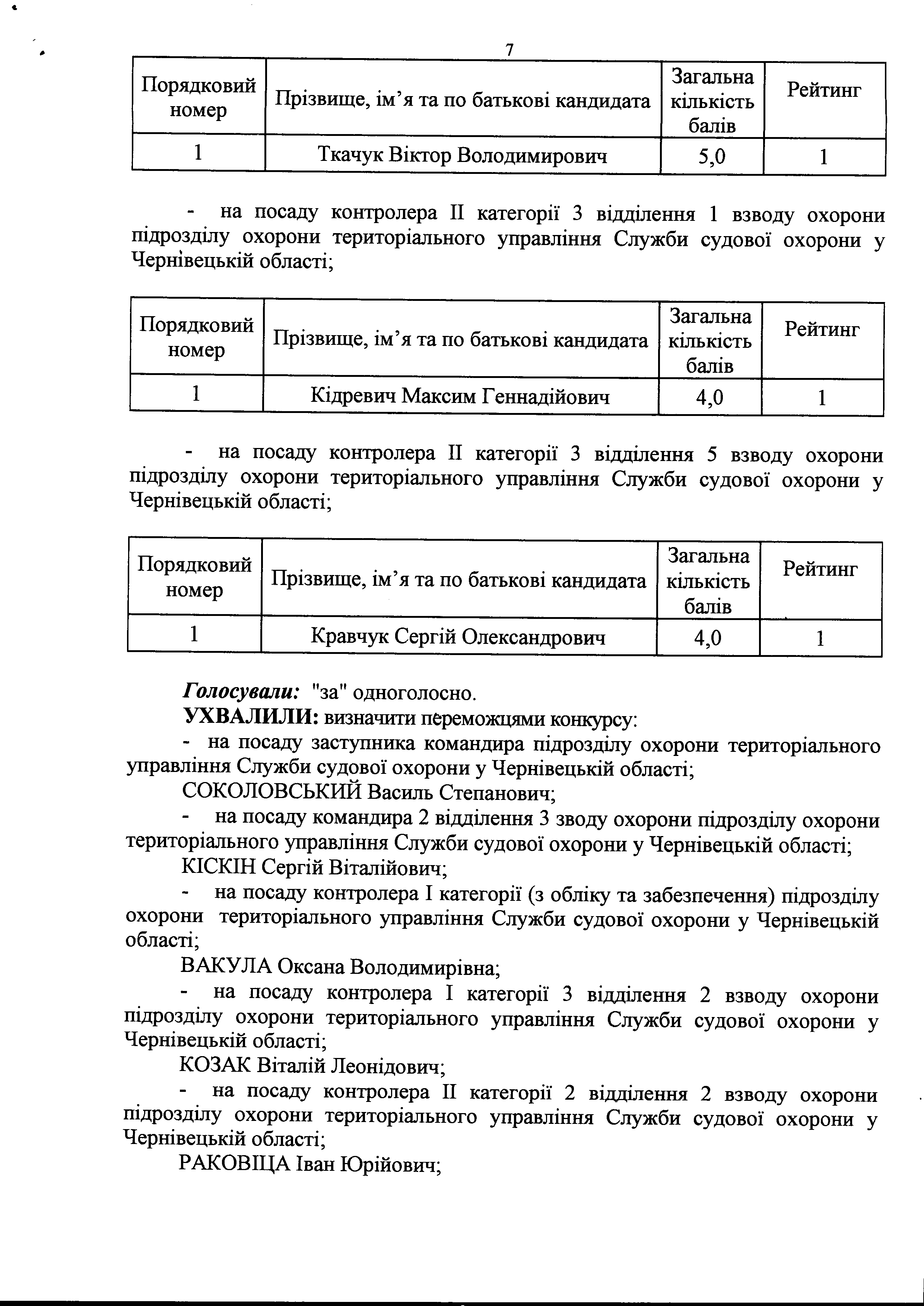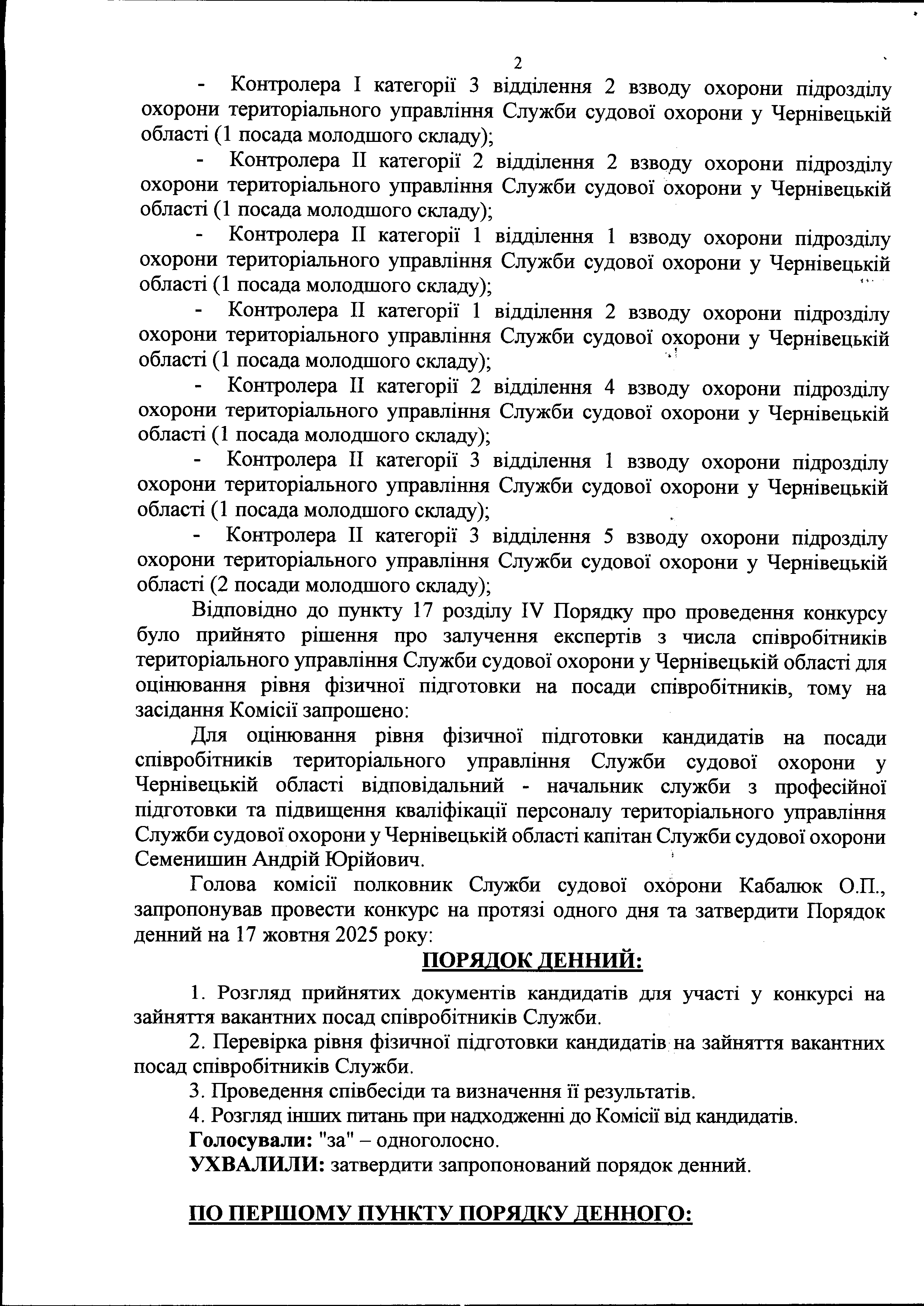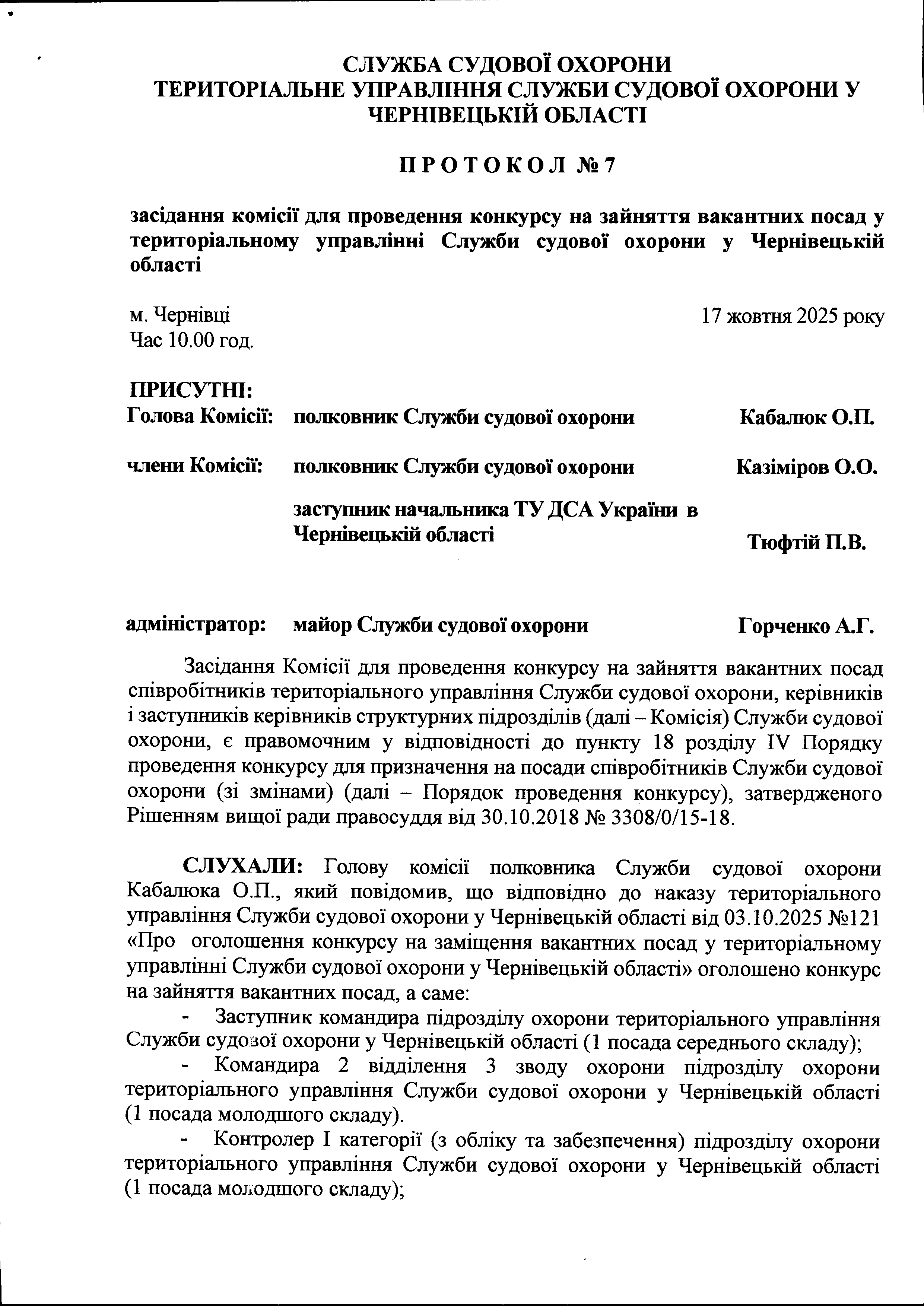 ПРОТОКОЛ №7 засідання комісії для проведення конкурсу на зайняття вакантних посад у територіальному управлінні Служби судової охорони у Чернівецькій області від 17 жовтня 2025 року
