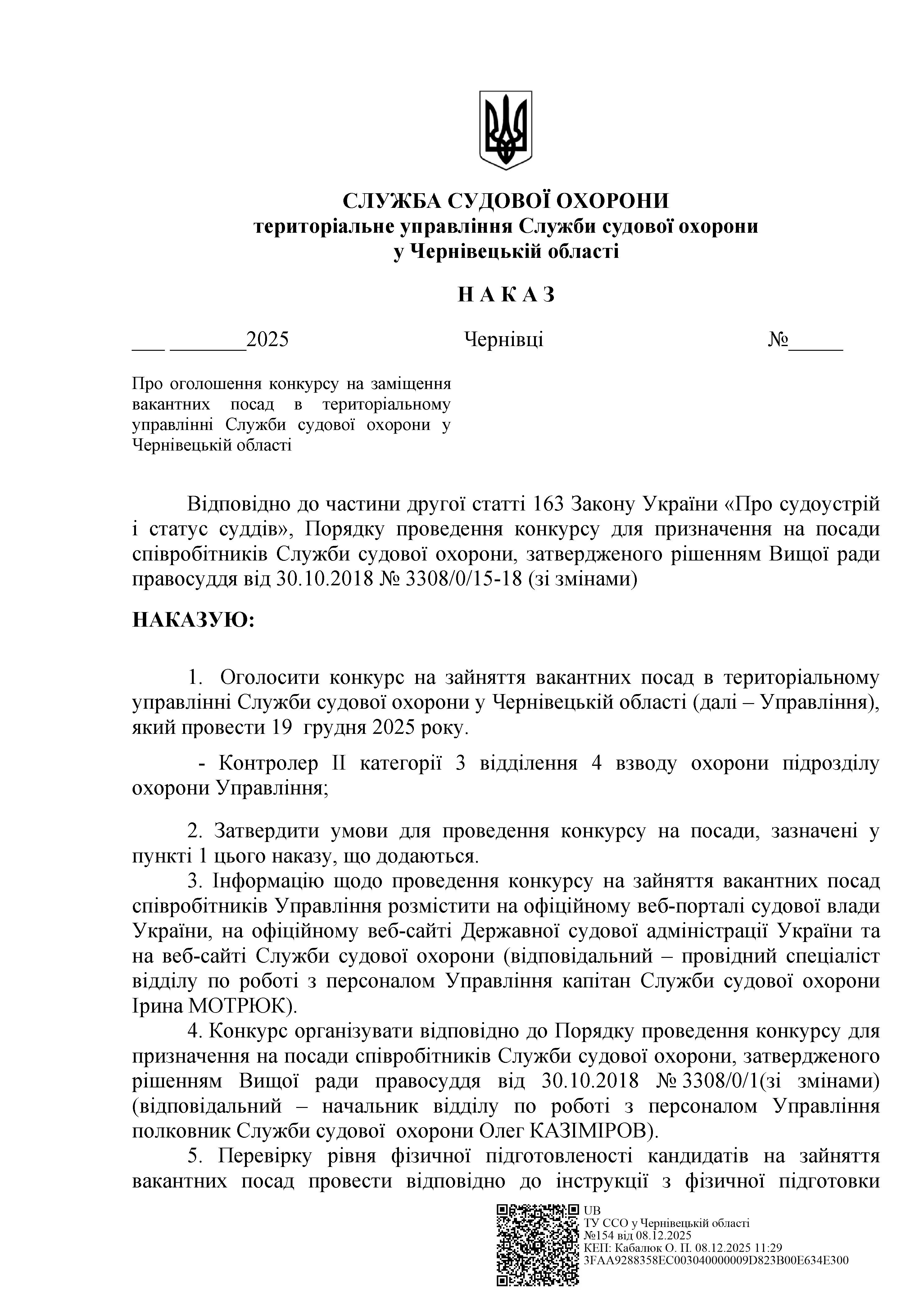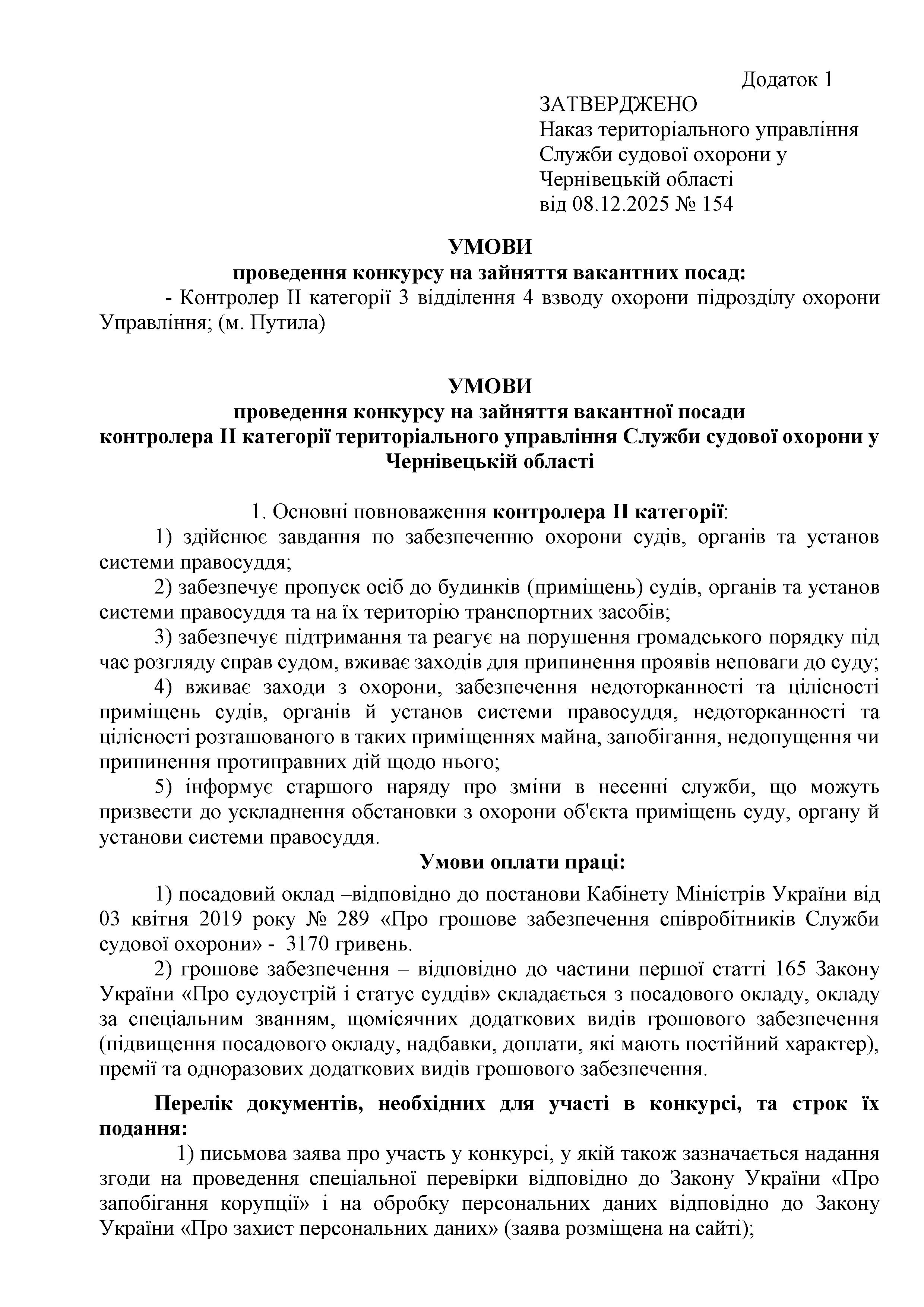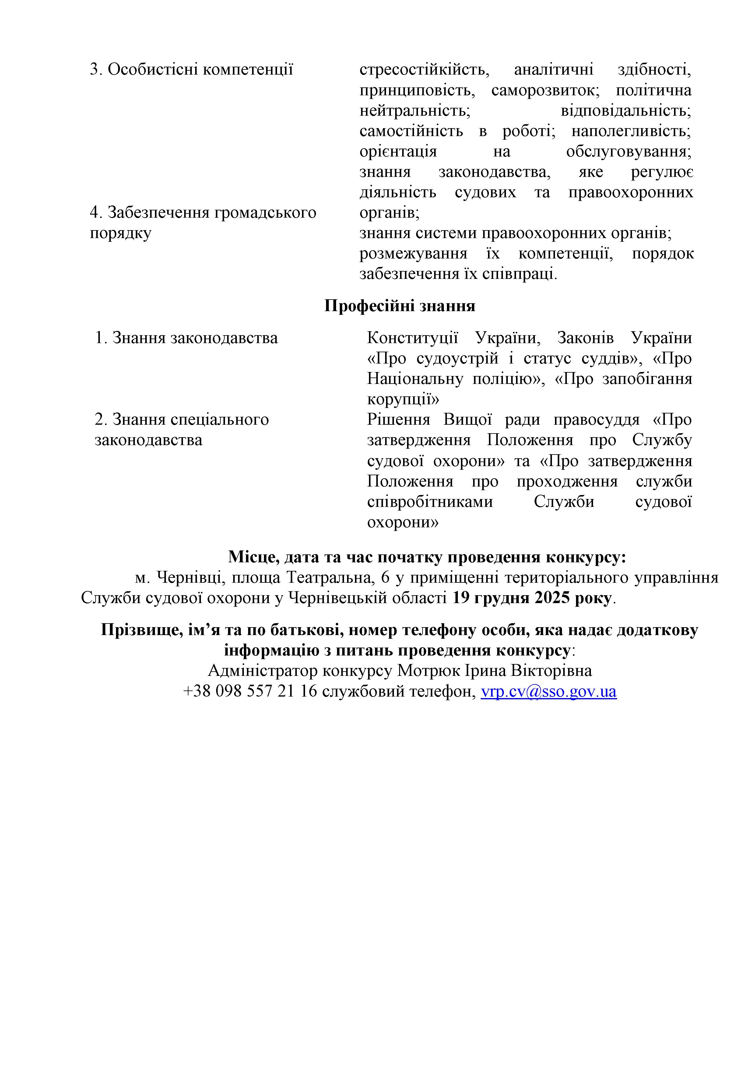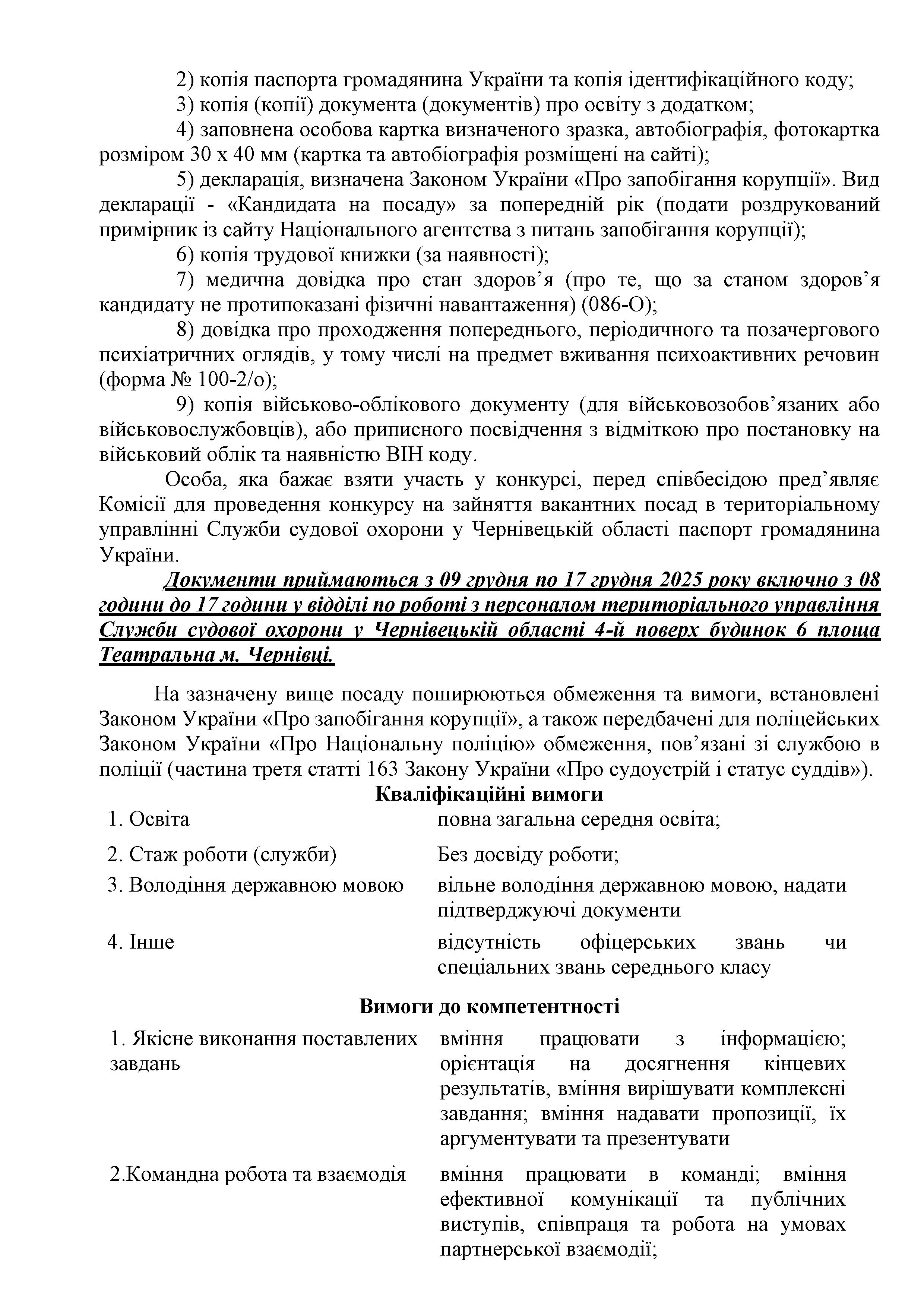 Оголошено конкурс на заміщення вакантних посад у територіальному управлінні Служби судової охорони у Чернівецькій області